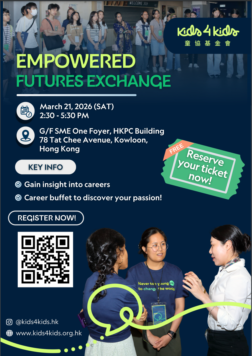 The Kids4Kids Empowered Futures Exchange is an interactive event aimed at empowering teenagers to take ownership of their futures. Through career-focused workshops and sharings, participants will have the opportunity to engage with professionals from various industries, gaining insights into their passions and discovering new interests.