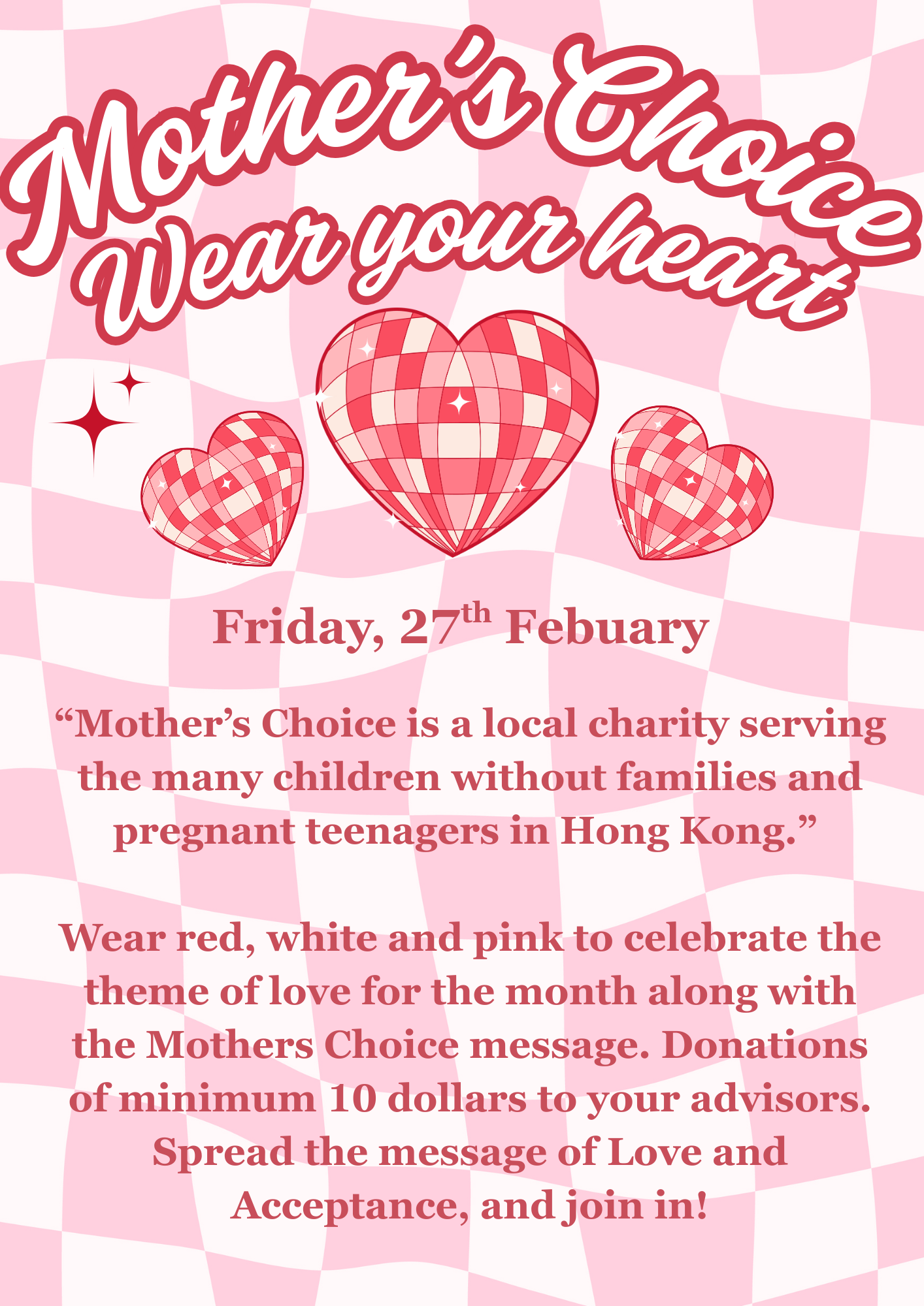 On behalf of the Mothers Choice group at RCHK we are excited to announce a Free Dress day on the 27th of February, this free dress day combines the theme of love for the month along with the Mothers Choice message.